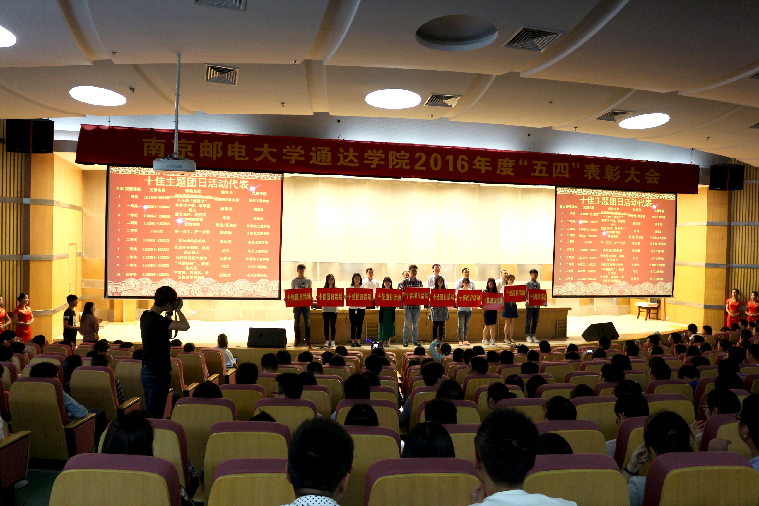 5月4日下午,万象城官网2015-2016学年“五四”评优表彰大会在行政楼报告厅隆重举行。院党委书记戴兆骏,党委副书记王立辉,招生就业处处长许明、副处长陈平波,团委书记解厚荣以及全体辅导员,各班学生代表,各学生社团代表约500人参加了本次大会。会议由团委书记解厚荣主持。