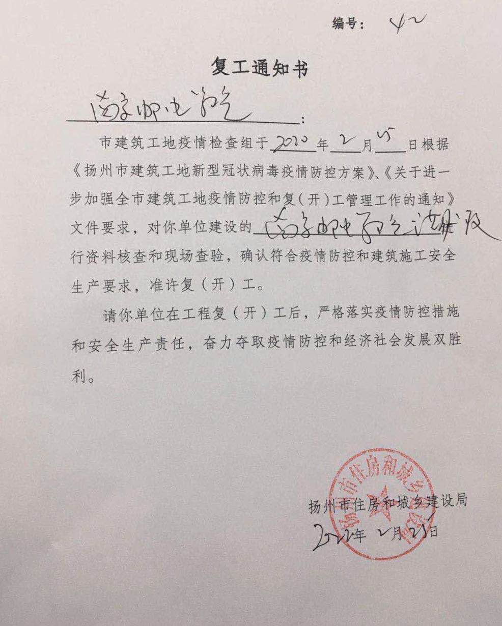 经过联合检查,南邮awc777万象城娱乐官网二期工程二标段通过资料核查和现场查验,确认符合疫情防控和建筑安全生产要求,准许复工。