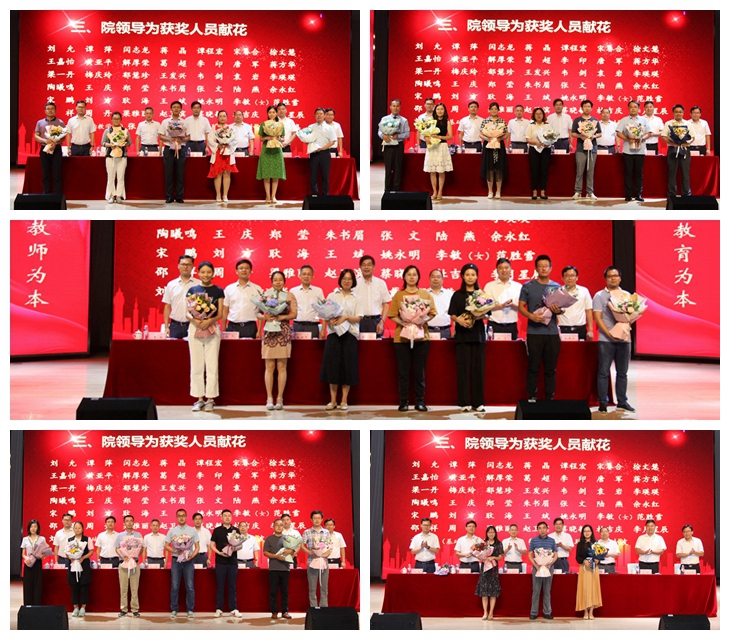 院长王承宽代表学院向全院教职工致以节日最美好的祝愿和最亲切的问候,宣读了《关于对2019-2020学年教职工表彰的决定》,表彰过去一学年在提升科研水平、提高教学技能、指导学生竞赛以及完善综合服务等方面取得突出成绩的先进个人。全体院领导代表全院万余名师生向获奖教职工礼敬献花,向他们表示热烈地祝贺和崇高的敬意,衷心感谢大家为建设一流应用型大学付出的辛勤劳动。
