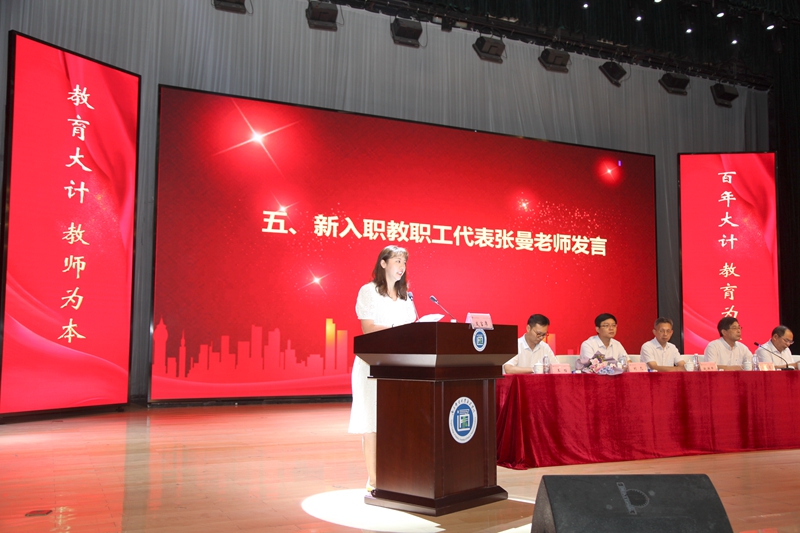 新入职教职工代表、学工处辅导员张曼老师在发言中指出,成为一名优秀的高校教师是她从小的志愿,希望自己能成为学生的良师益友、知心朋友和人生导师。她表示,作为南邮awc777万象城娱乐官网的一名新人,将本着团结奉献的精神,为人师表,爱岗敬业,继承和发扬通达精神,为南邮awc777万象城娱乐官网的建设与发展贡献自己的智慧和力量。
