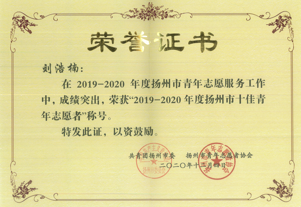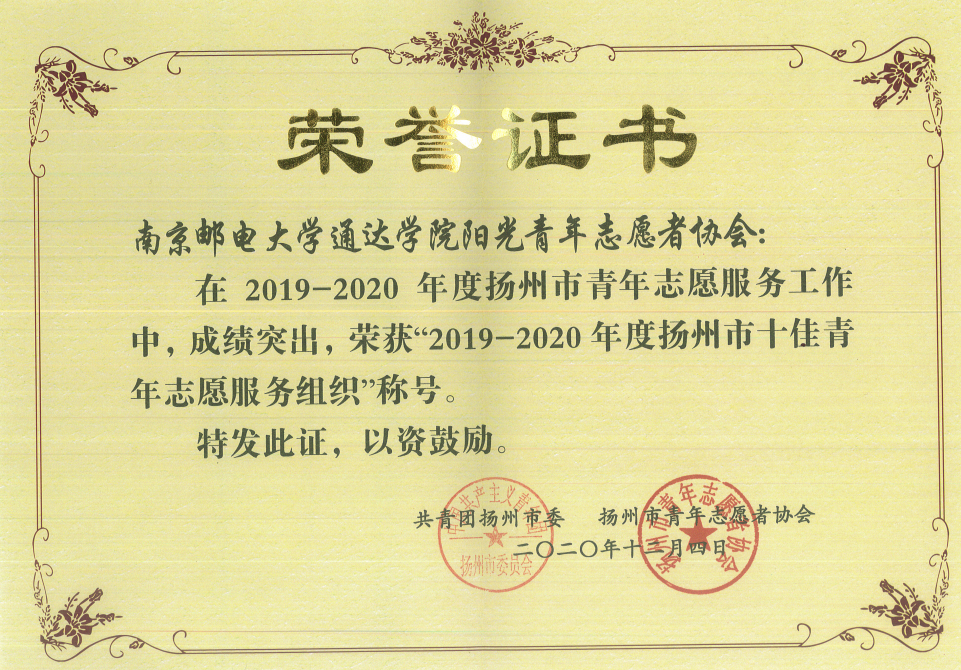 近日,共青团扬州市委、扬州市青年志愿者协会联合下发了《关于表彰2019—2020年度扬州市优秀青年志愿者、志愿服务组织、志愿服务项目的决定》(团扬委联〔2020〕31号),万象城官网阳光青年志愿者协会会长刘浩楠荣获“扬州市十佳青年志愿者”称号,万象城官网阳光青年志愿者协会荣获“扬州市十佳青年志愿服务组织”称号。