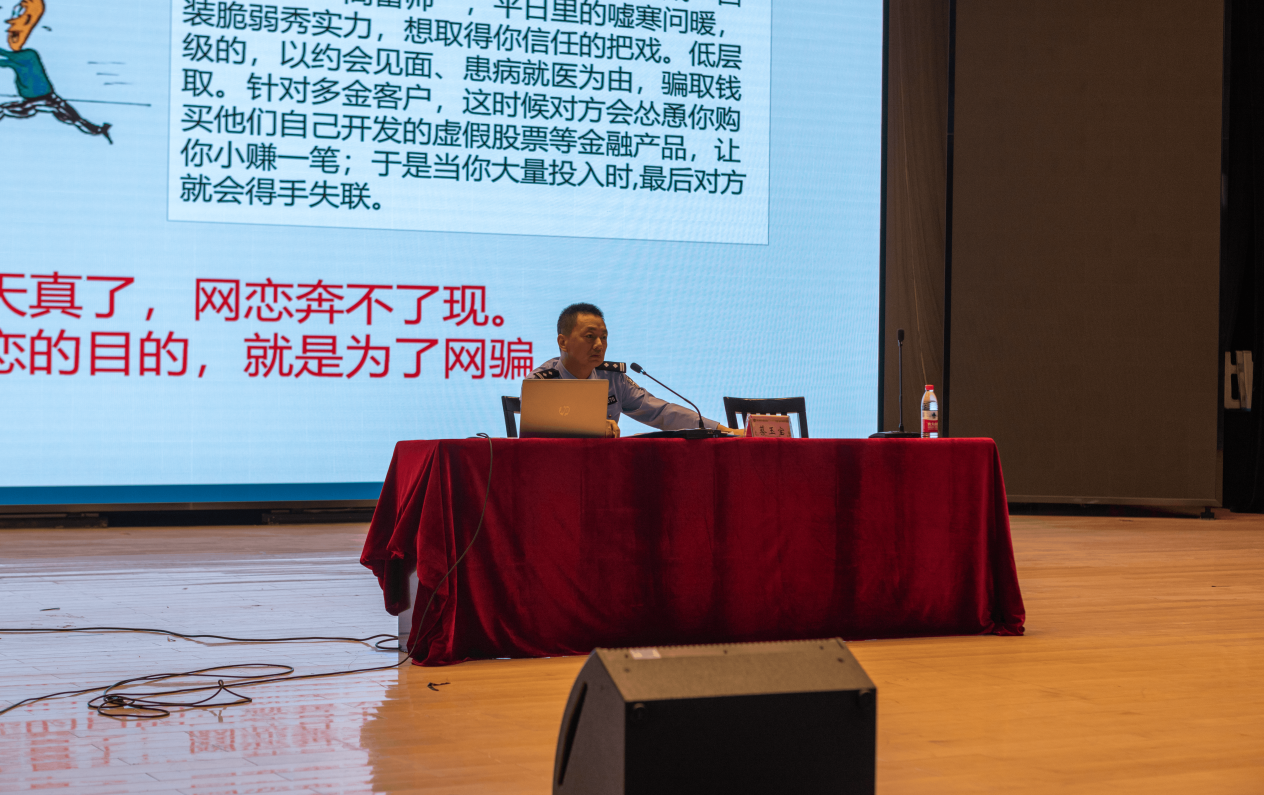 汊河派出所所长蔡玉宝同志从什么是诈骗及其特点、高校诈骗的常见形式两个方面,向同学们深入详细地介绍诈骗案的特点,围绕着如何识别防范电信诈骗和被骗后的补救措施等方面进行了讲解,并提出了建议和注意事项,并给同学们现场演示了如何在手机上安装由公安部刑事侦查局组织开发的防诈APP——“国家反诈中心”。