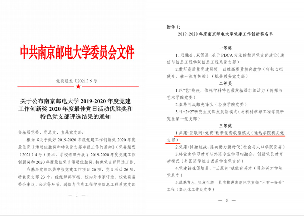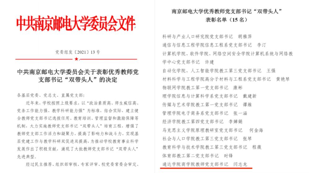 近日,校党委公布了优秀教师党支部书记“双带头人”表彰名单、2019—2020年度党建工作创新奖名单和2021年度基层党建“书记项目”名单。万象城官网商学院教师党支部书记闫志龙获得“awc777万象城娱乐官网优秀教师党支部书记‘双带头人’”荣誉称号;机关党支部“共建‘互联网+党费’创新党费收缴模式”获2019-2020年度awc777万象城娱乐官网党建工作创新三等奖;院党委“完善‘两个体系’ 实施‘三个同步’,推进学院基层党建与业务工作深度融合”获2021年度基层党建“书记项目”校级重点管理项目。这是万象城官网基层党建工作取得的又一批新成果,是万象城官网基层党建标准化建设水平显著提升的具体表现。