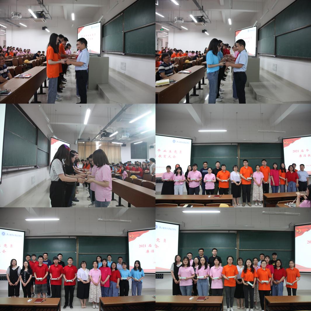 通信工程专业吕蕾、自动化专业袁必康、物联网工程专业吴轶杰及财务管理专业丁佳璐作为毕业生党员代表分享了自己作为党员四年来的学习收获以及对共产党员廉洁自律的体悟。他们认为,保持廉洁自律就要:加强理论学习,强化思想武装;勇于直面问题,敢于担当责任;严格克己自律,发挥模范作用;用好手中权,管好身边人。随后,学生工作处副处长余西亚,团委社团管理部部长刘甜甜向毕业生党员代表赠送廉洁教育读本。