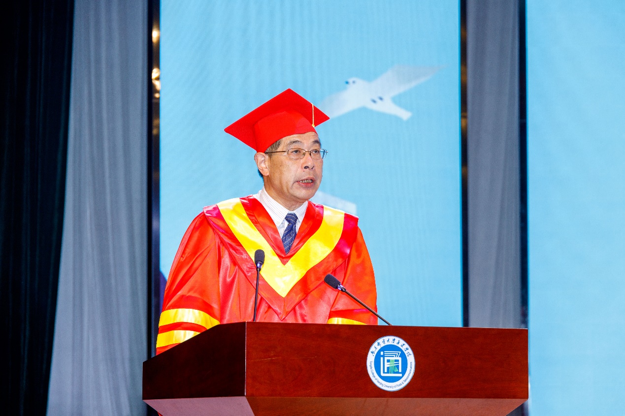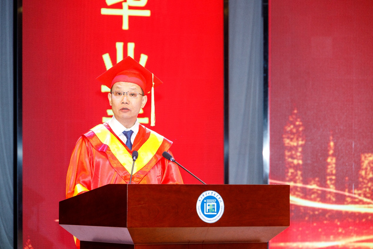 awc777万象城娱乐官网党委常委、副校长荆晅教授作题为《胸怀国之大者 勇做时代新人》的讲话。他代表awc777万象城娱乐官网向同学们表示热烈的祝贺!向老师和家长们致以崇高的敬意和衷心的感谢!他寄语毕业生们“胸怀国之大者,勇做时代新人”。一是成为肩负使命的青年人。希望大家要把爱国爱民的精神内化于心、外化于行,在民族复兴征程中成就精彩人生。二是成为战胜困难的实干者。希望大家在告别校园后,要脚踏实地、埋头苦干,充分实现人生价值。三是成为快乐优雅的生活家。希望同学们以一颗仁爱之心对待生活,善于发现好,创造美,在天宽地阔的美好中保持乐观、积极、向上的生活状态。