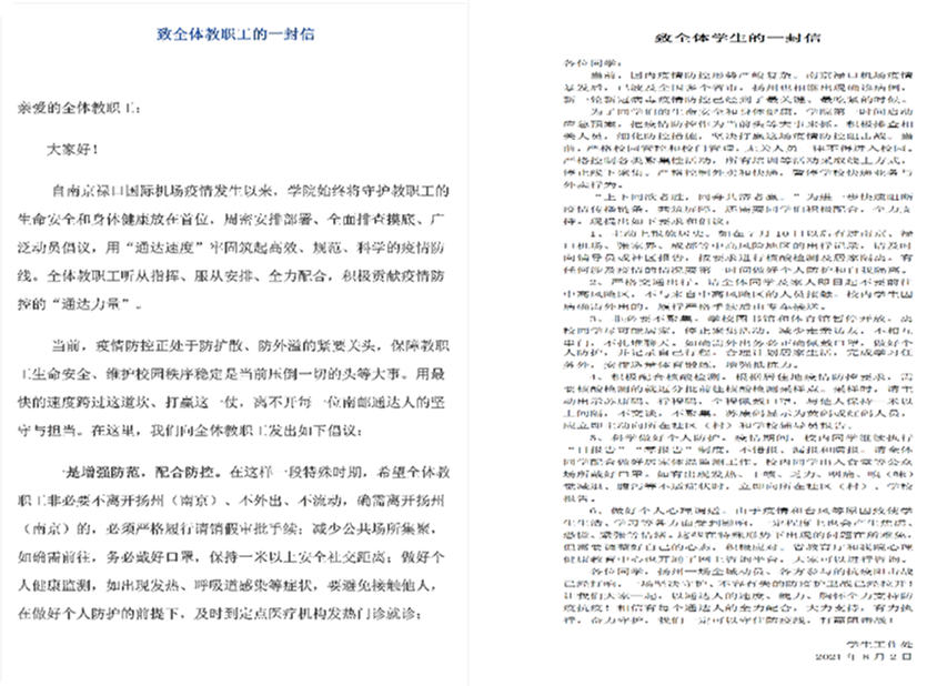扎实做好在校师生信息排查工作,分别就有无前往禄口机场、中高风险地区旅居史等情况进行摸排,确保信息准确;实行校园封闭式管理,为留校学生安排好后勤保障服务;加强宣传,通过校园网、官方微信、QQ群等,及时发布《致全体教职工的一封信》《致全体学生的一封信》《关于进一步强化疫情防控的紧急通知》等通知公告;通过多种形式,切实加强对师生的思想关注、生活关爱和心理关怀。