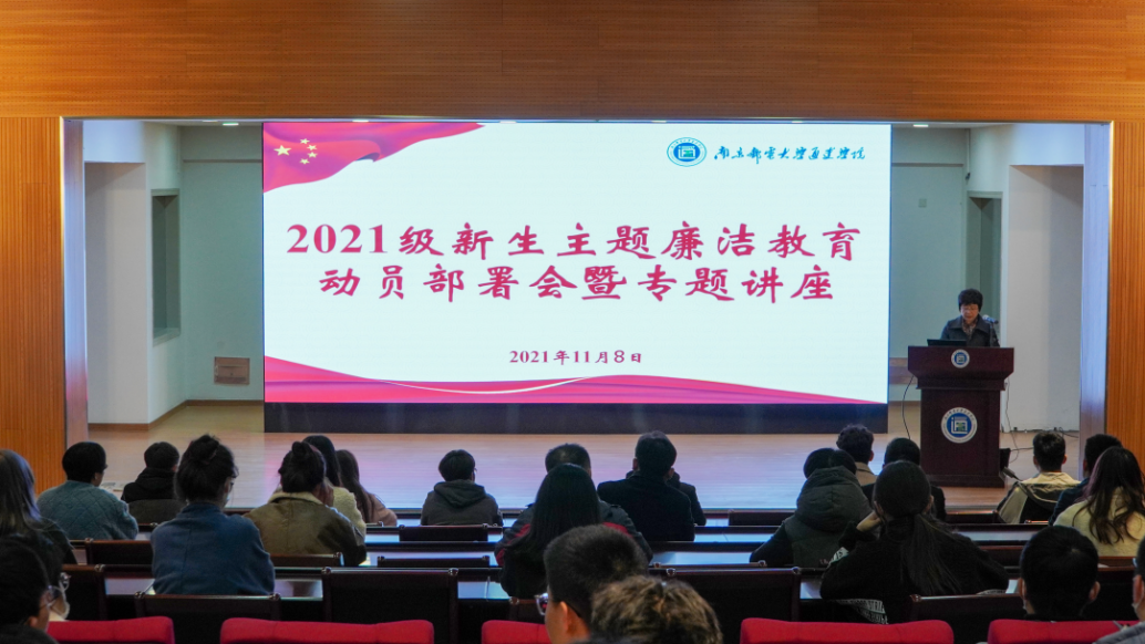 专题讲座释“廉洁要义”。11月8日,学院召开“廉洁清风劲 扬帆新征程”2021级新生主题廉洁教育动员部署会暨专题讲座,观看教育视频、部署活动安排、赠送廉洁读本、进行廉洁宣誓。院纪委书记张建波作了题为《弘扬廉洁风尚 建强立身之基》的专题讲座,围绕“重温正风肃纪反腐的六个第一”“十八大以来的中国廉政实践”“大学生廉洁教育的思考及启示”三个方面展开,重点讲述了大学生不廉洁修身的表现,并希望新生注重涵养清正廉洁品质,始终守住廉洁底线。
