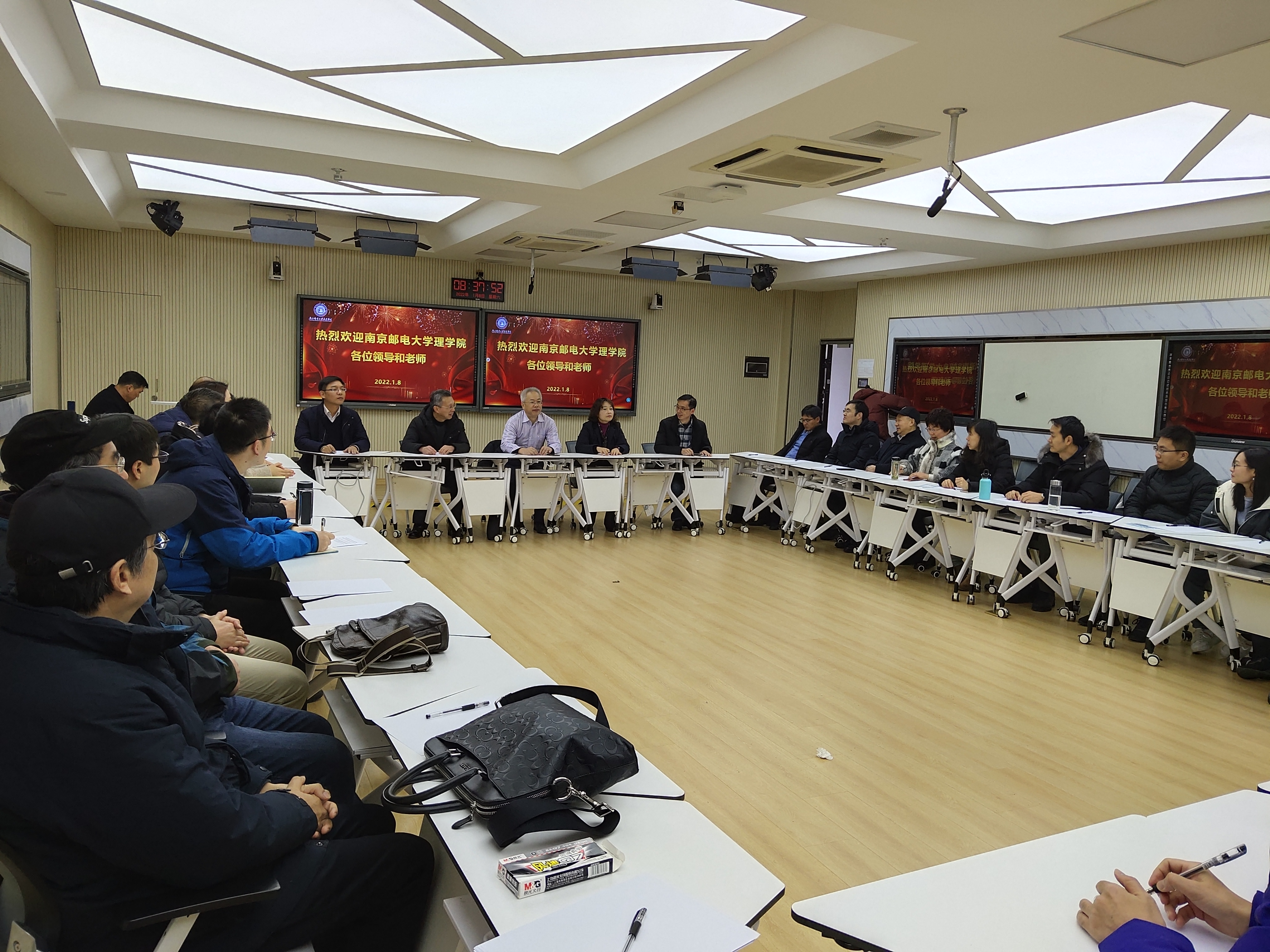 2022年1月8日上午,awc777万象城娱乐官网组织部部长王友国、理学院党委书记尹志丽、院长唐加山等一行来万象城官网进行共建交流。万象城官网常务副院长赵洪牛、副院长刘允、教务处、基础部相关领导及数学、物理教研室部分老师参加了交流会。