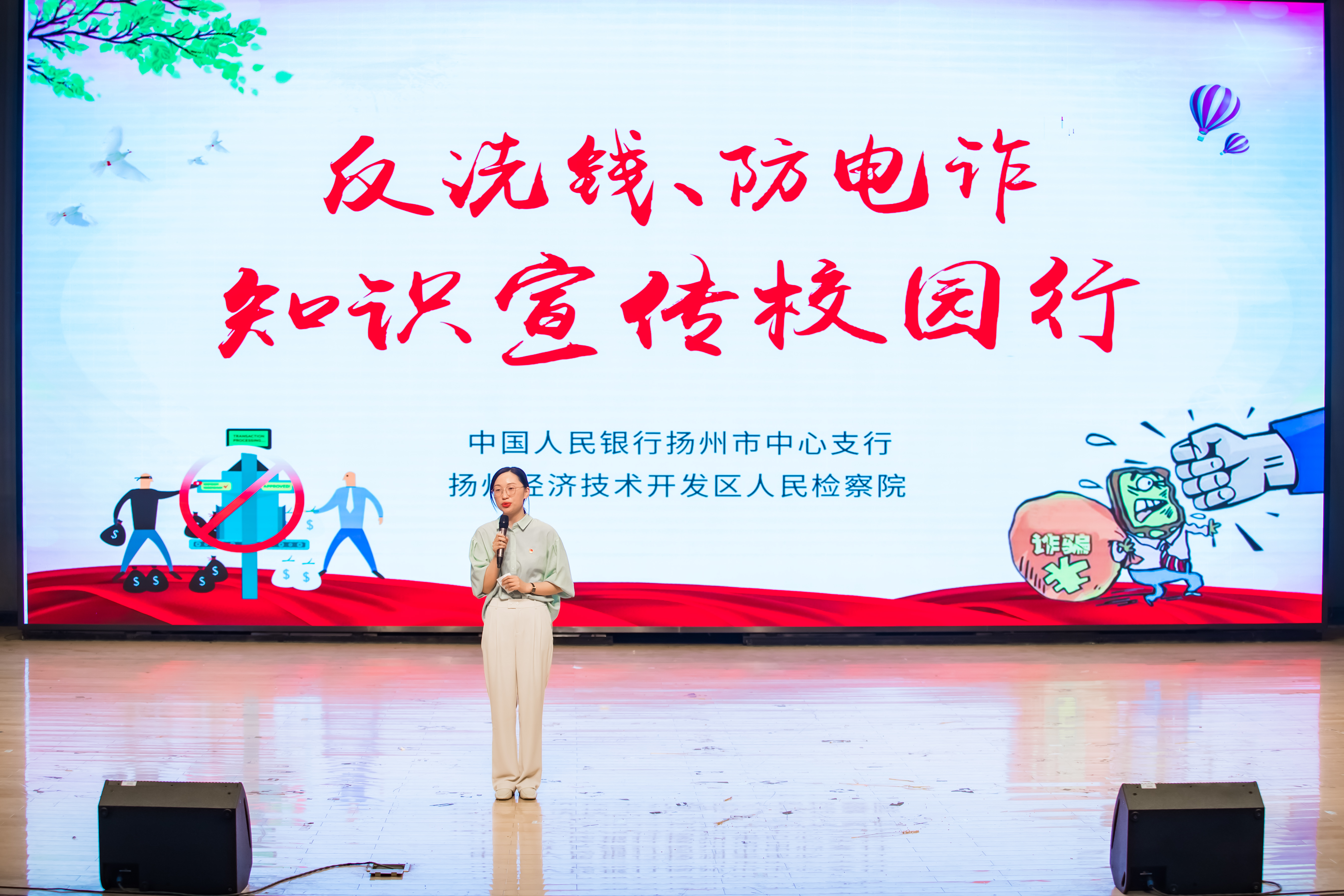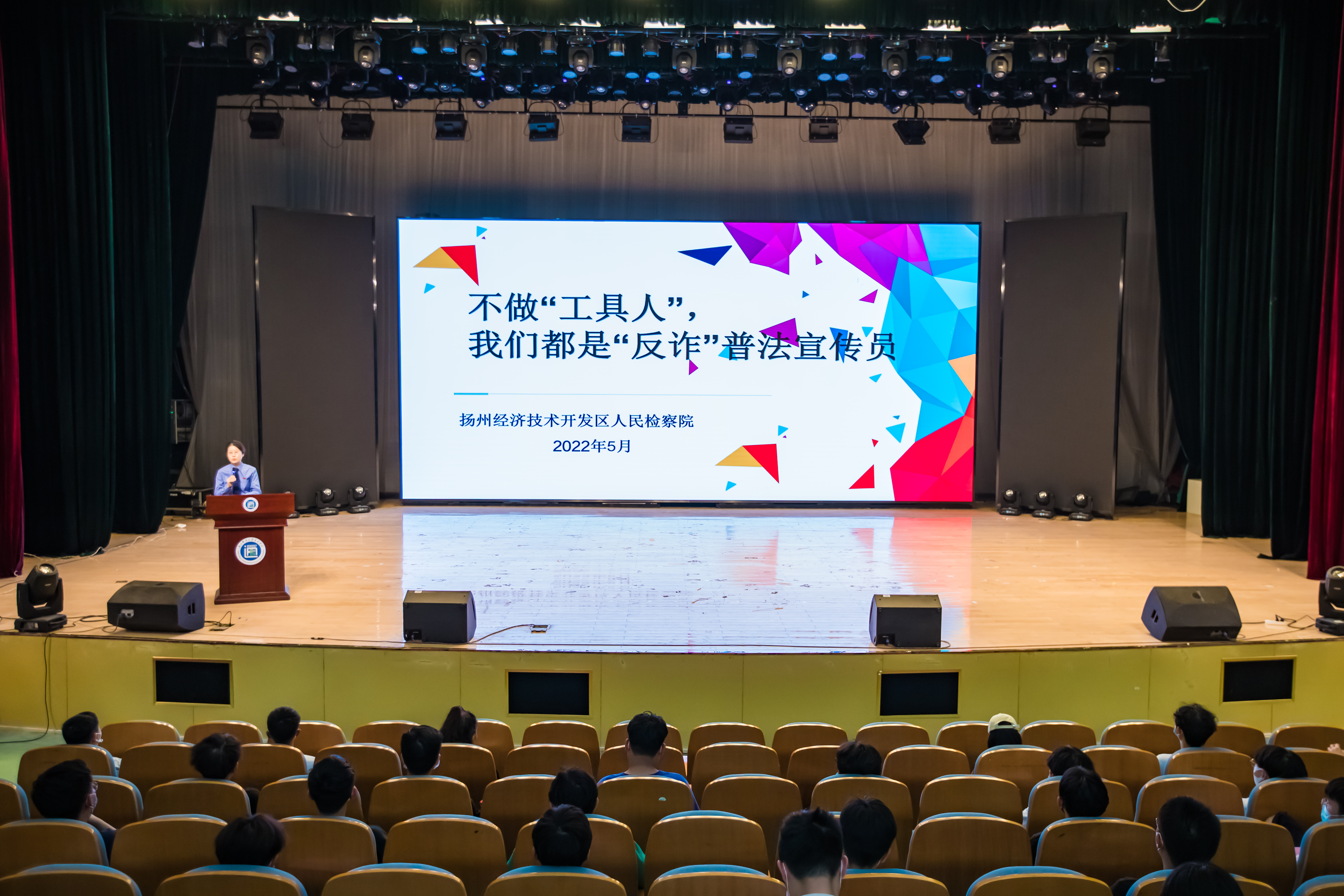 扬州市经济技术开发区人民检察院党组书记、检察长王珺子作《不作“工具人”,我们都是“反诈”普法宣传员》主题报告。王检察长通过介绍五个典型案例,播放《青春无“诈”》微电影,形象生动地向同学们讲解了什么是电信网络诈骗、常见的电信网络诈骗类型有哪些、诈骗罪的主要适用法律解读等内容。