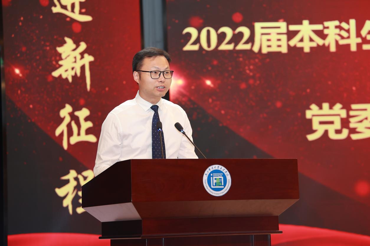 王国平院长致辞2022届毕业生。他代表全院师生员工,向全体毕业生表示热烈的祝贺,向老师和管理服务人员表示衷心的感谢,向倾力倾心培育同学们成长成才的父母表示崇高的敬意!他全程以“同于不同”、“安于不安”、“难与不难”、“确定与不确定”、“危与机”为主题,并勉励全体毕业生:一要坚定理想信念,实现人生价值,希望同学们在新的人生起点上以确定的目标、决心和行动把不确定转变为确定,转危为机,不负韶华,不负时代。二要奋斗不息,追求卓越自我,伟大的背后都是苦难,而将苦难炼化成伟大的,却是那份勇于挑战苦难的执着奋斗,希望同学们持续践行“生命不息,奋斗不止”的理念,做一个不懈努力的人。三要宽厚包容,成就美丽人生,海纳百川、有容乃大;壁立千仞,无欲则刚,希望同学们在未来的人生中继续坚持学习,静心沉潜,通过不断学习提高远见,开阔格局,超越自我。
