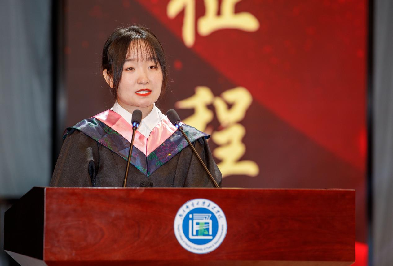 依依不舍离母校,扬帆起航踏征程。毕业典礼上,教师代表闫志龙深情回忆了同学们在校的点点滴滴,希望同学们记得常回家看看,继续与老师分享未来的喜悦与懊恼。线下学生代表郝荣发言,她深情地诉说着大学四年对母校、对恩师、对父母、对同窗的感恩之情,表示今后身处时代洪流,仍听从内心召唤,永远做一个豪情满怀,心似火焰的有梦少年。线上学生代表王澄盈、张祥泽、兰心怡、张敏洋、李铄玙、刘淑琳也通过“云端”视频表达了他们对母校的感恩之情,祝愿母校越来越好,同时祝福同学们一路通达。宿舍管理员代表王格平用朴实无华的语言分享了四年中同学们的成长和蜕变,希望同学们能在最好的年华,做最好的自己。