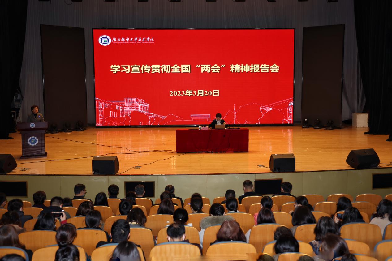 3月20日上午,学院举办全国两会精神学习宣传贯彻报告会,十四届全国人大代表、awc777万象城娱乐官网校长、南邮awc777万象城娱乐官网理事长叶美兰教授应邀来万象城官网作首场传达宣讲报告。院领导、全体教职工以及学生代表在学生活动中心参加报告会。报告会由党委书记朱清主持。