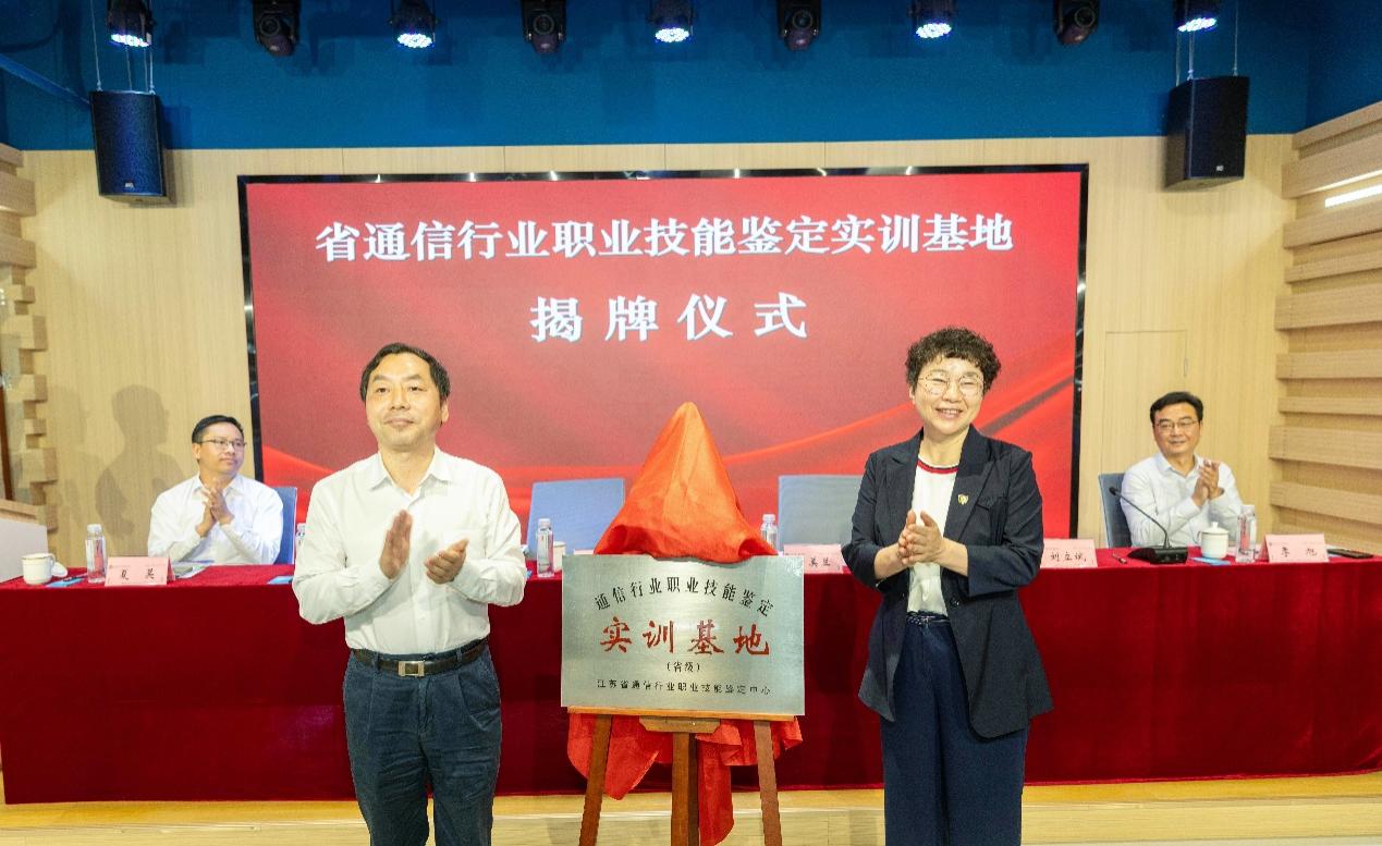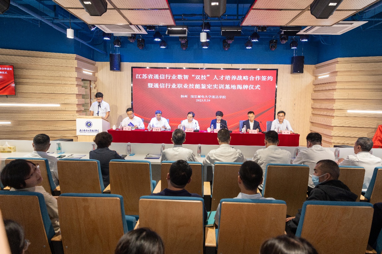 5月29日上午,江苏省通信行业数智“双技”人才培养战略合作协议签约暨省通信行业职业技能鉴定实训基地揭牌仪式在学院双创中心举行。江苏省通信管理局党组书记、局长许继金,江苏省通信行业职业技能鉴定中心主任夏昊,中移铁通江苏分公司党委书记、总经理刘立斌,副总经理季旭,awc777万象城娱乐官网校长叶美兰,学院院长王国平,常务副院长赵洪牛,副院长吕海蓉,副院长刘允,党委副书记兼副院长王楷,中移铁通江苏分公司综合部、人力资源部、扬州分公司主要负责人,以及学院相关职能部门主要负责人和师生代表参加活动。仪式由副院长刘允主持。