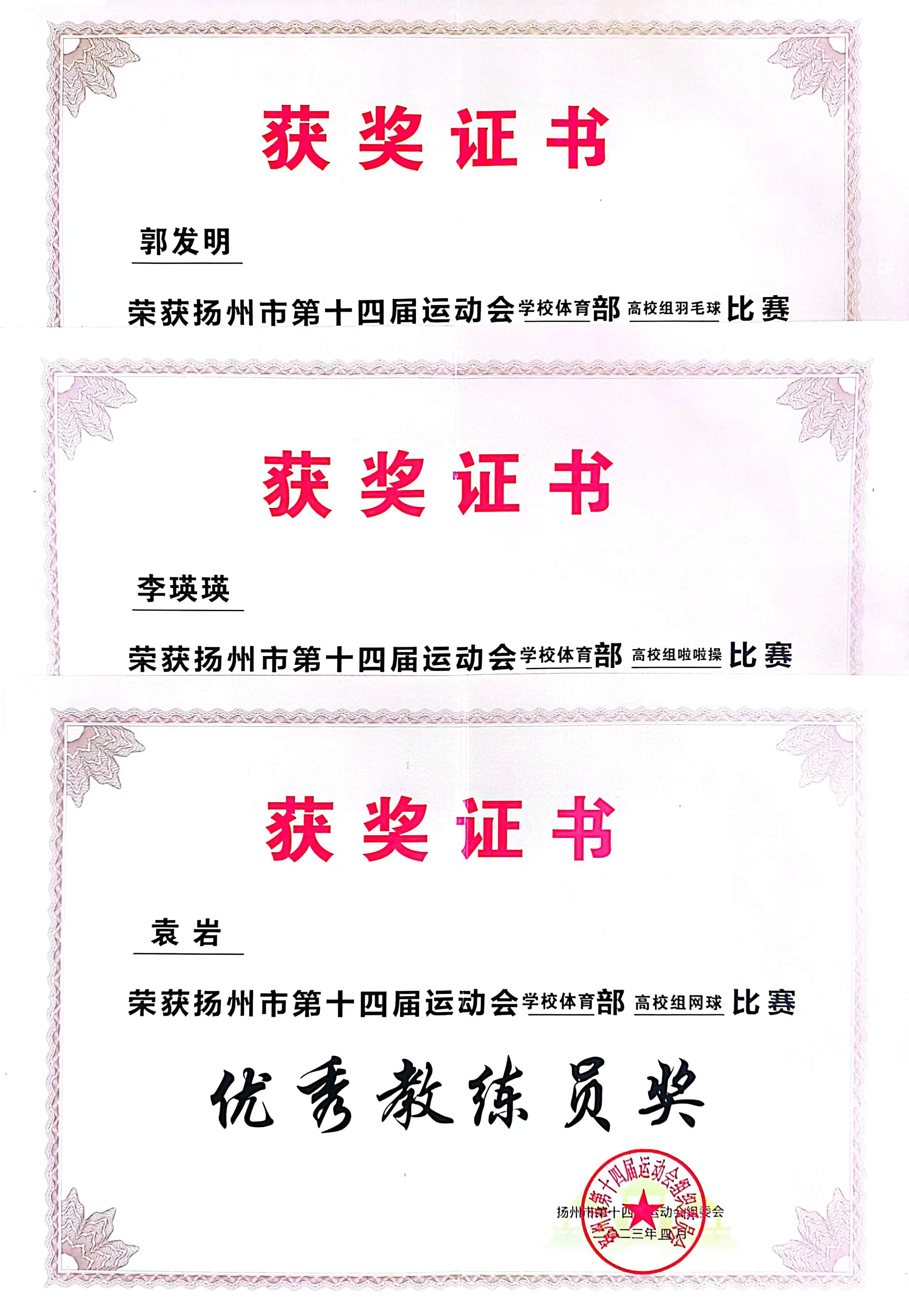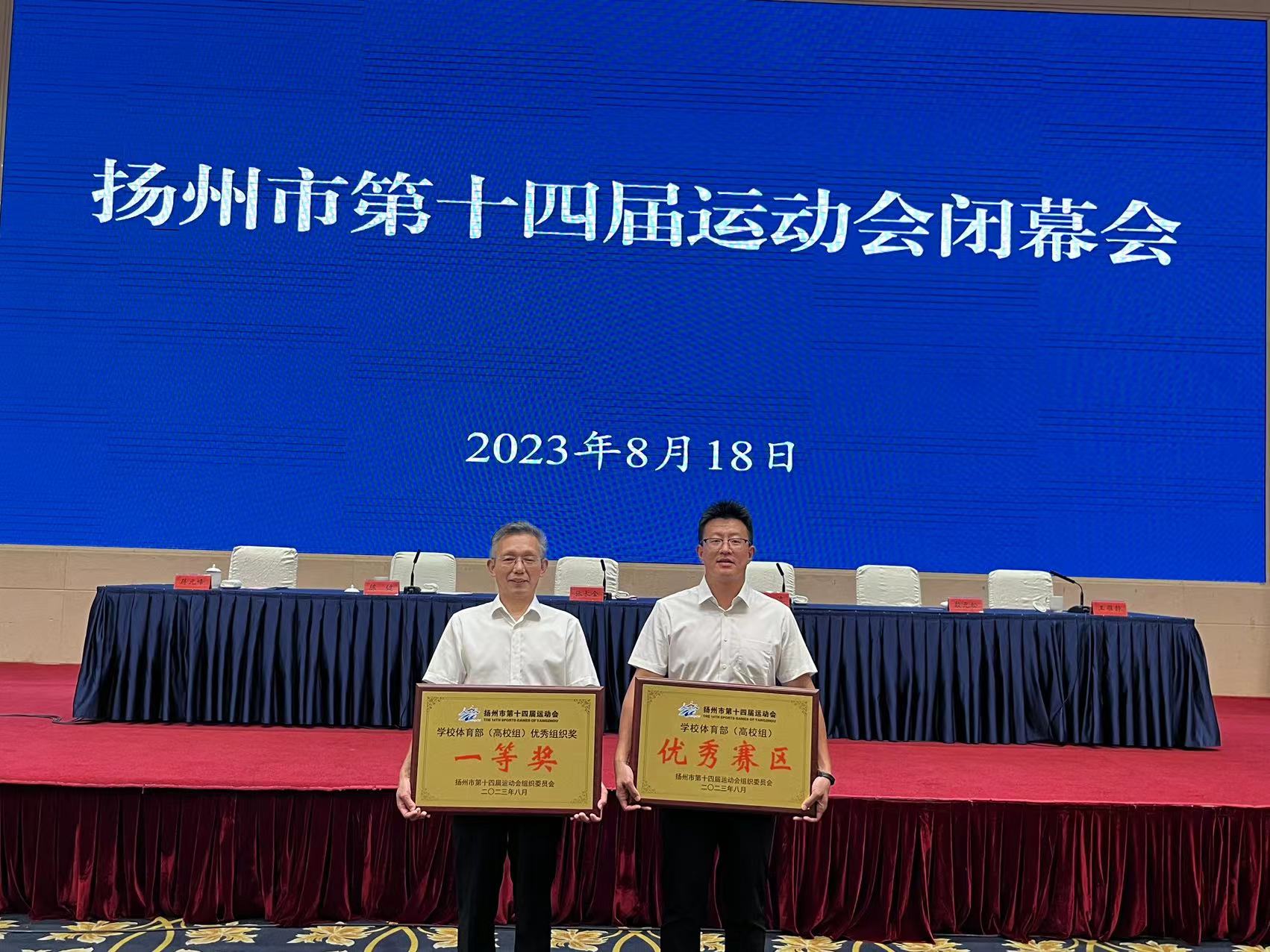 2023年8月18日下午,扬州市第十四届运动会闭幕式暨表彰大会在市会议中心举行,万象城官网代表团荣获高校部团体总分第一名,金牌榜第二名的佳绩,并获“优秀组织奖一等奖”、“优秀赛区奖”称号。万象城官网袁岩、李瑛瑛、郭发明三位教师荣获优秀教练员称号。