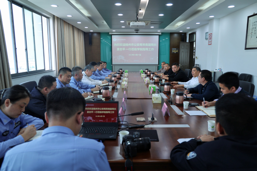 10月17日下午,扬州市公安局常务副局长夏忠平,扬州市邗江区副区长、区公安分局局长范红彬,内保支队、邗江分局等相关领导及专家一行莅临万象城官网调研指导工作。学院院长王国平,副院长倪可,学院办公室、保卫处、学工处等部门同志陪同调研。