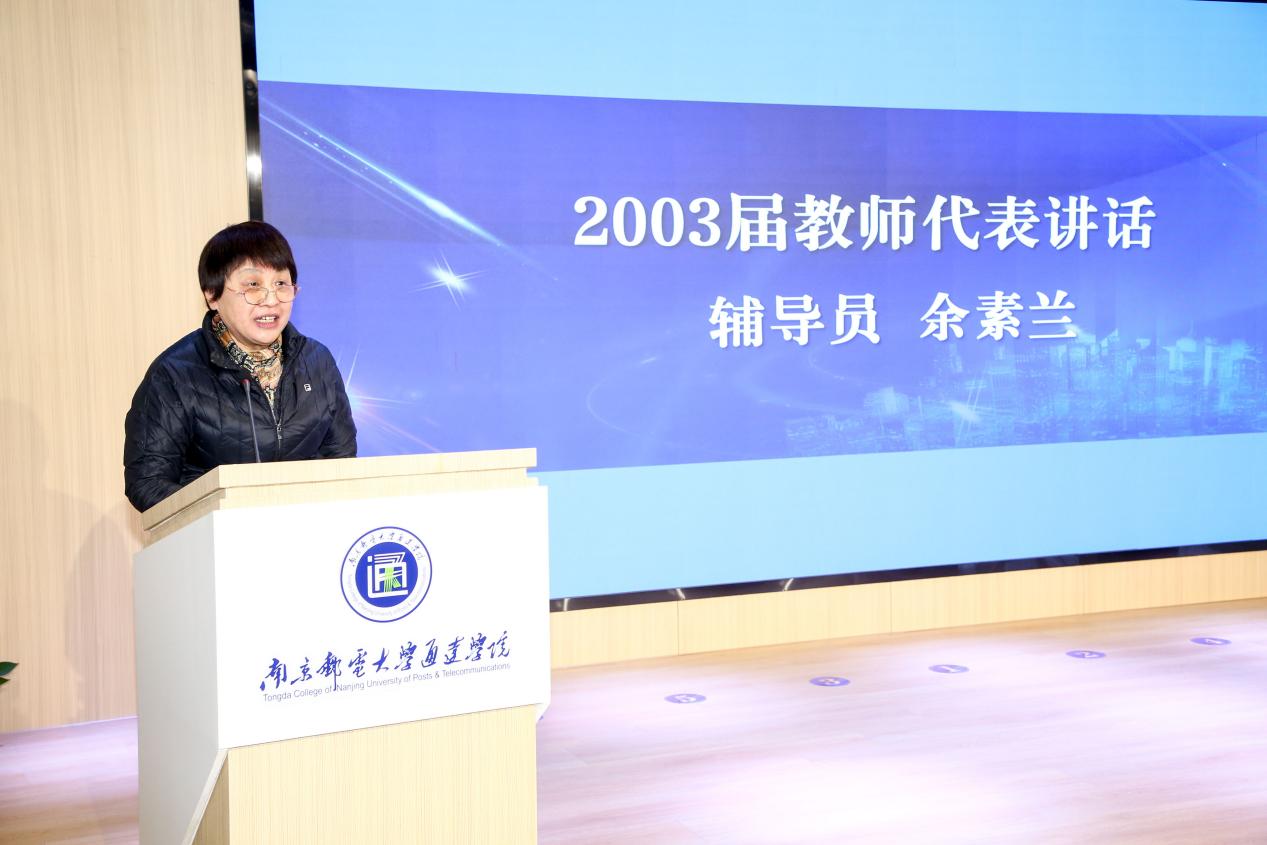 2003届辅导员余素兰老师作为教师代表讲话,余老师回忆往昔不禁潸然泪下;展望未来,愿师生情、同学情历久弥新,经久不衰。