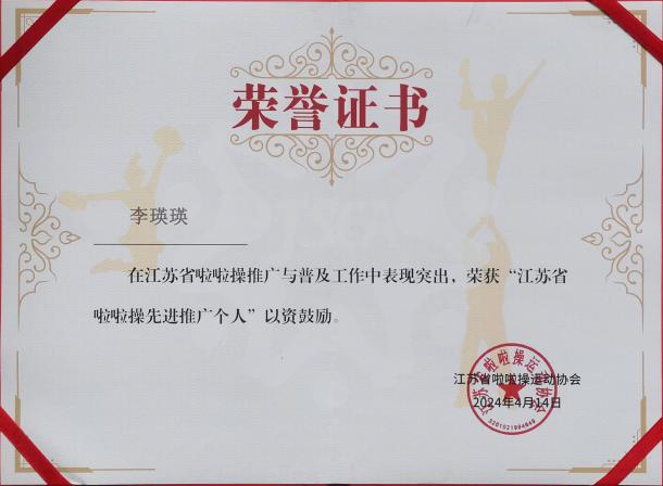 万象城官网李瑛瑛老师被授予“江苏省啦啦操先进推广个人”